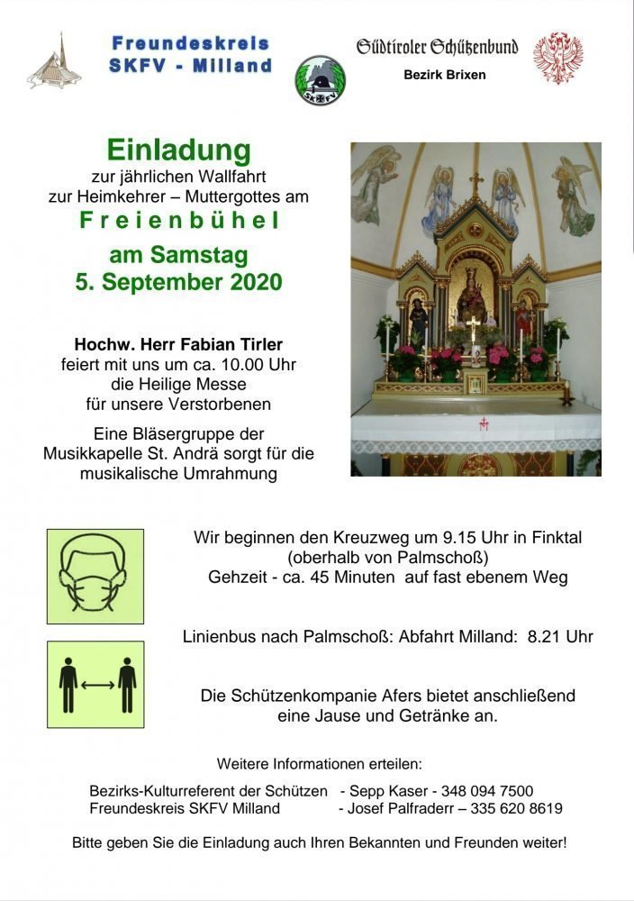 Einladung zur jährlichen Wallfahrt zur Heimkehrer – Muttergottes am Freienbühel 26. August 2020 Einladung Freihenbühel 2020